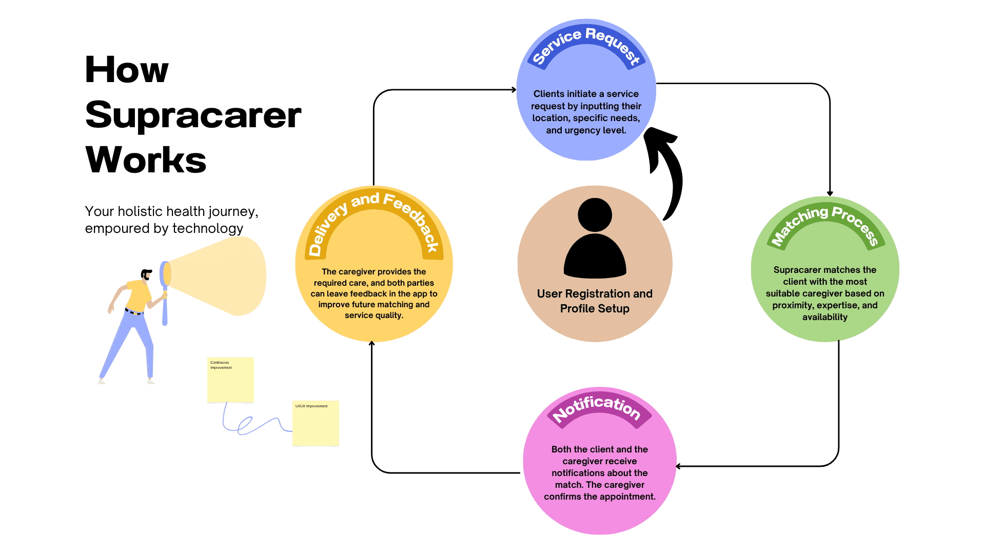 Supracarer matches the client with the most suitable caregiver based on proximity, expertise, and availability.